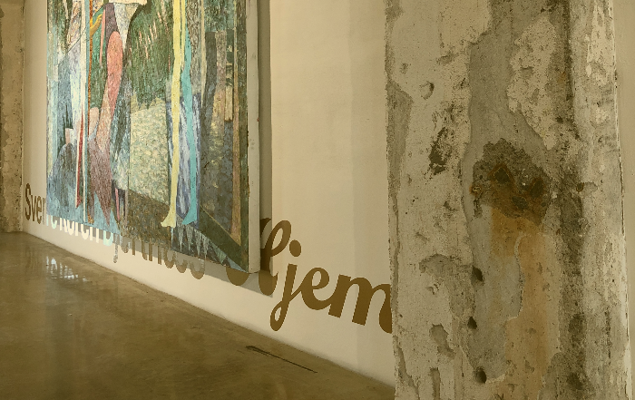 Utstilling er dominert av et 24 meter langt maleri «Lakseskatten» som dekker en hel vegg i det lyse store rommet i 2. etasje. Da vi var på besøk, rett før utstillingen åpnet, la kunstneren en absolutt siste hånd på verket etter intens jobbing gjennom vinter og vår. Maleriet har et dystert tema med lobotomering, sterilisering og terror. Men med sine sterke farger, motivsammensetning og tekst fremstår budskapet i et helt spesielt lys. Krakkene som står midt i rommet er der for en grunn. Her skal man sitte, bevege seg bortover langs maleriet og la inntrykkene flomme inn over seg.