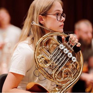 Sandra spiller vakker musikk på et instrument som heter Walthorn. Det er et messinginstrument bestående av et 3-4 meter langt tynt rør som er rullet sammen i et intrikat mønster. Vi kan godt forstå at det er betegnet som vanskelig å spille på, for gjennom det røret blåses luft mens ventiler åpnes og lukkes. Det forteller oss litt om hennes talent og nivå, når hun nå som 21 åring allerede er vikargodkjent i Den norske Opera og Ballett, samt KORK. Hun har også spilt med Ungdomssymfonikerne i både 2022 og 2023.