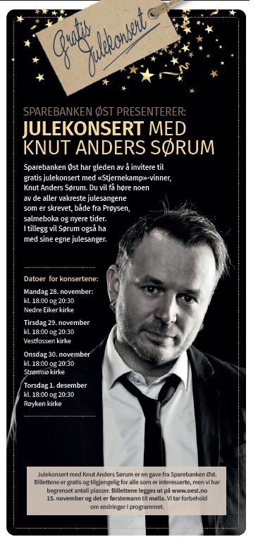 Julekonsertene med Heine Totland, Karianne Kjærnes, Gisle Børge Styve/Roger Allan Ivin er en julegave fra Sparebanken Øst. Billettene er gratis.