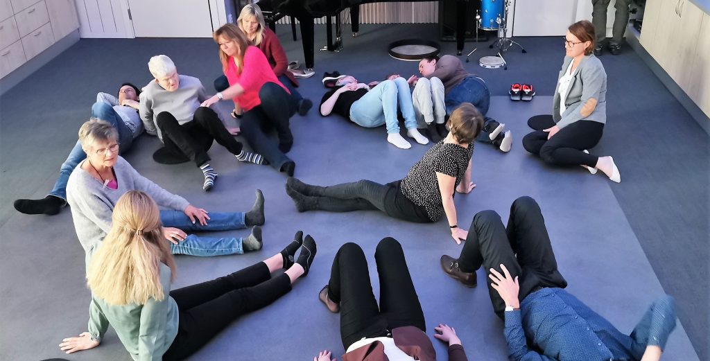 Kunderådgiver på Konnerud Rebecca Iversen og avdelingsbanksjef Anette F. Green fikk en god og spesiell opplevelse da de, sammen med brukere og ansatte la seg ned på gulvet og toner fra den lokale artisten Jonas Fjeld strømmet ut gjennom høyttalerne. Vibrasjonene som da gikk gjennom gulvet kjentes godt i kroppen og skapte en rolig og behagelig atmosfære . Det var helt tydelig at denne formen for aktivitet var med på å åpne sansene for gode opplevelser, skape velvære og roe ned frustrasjoner og indre uro.