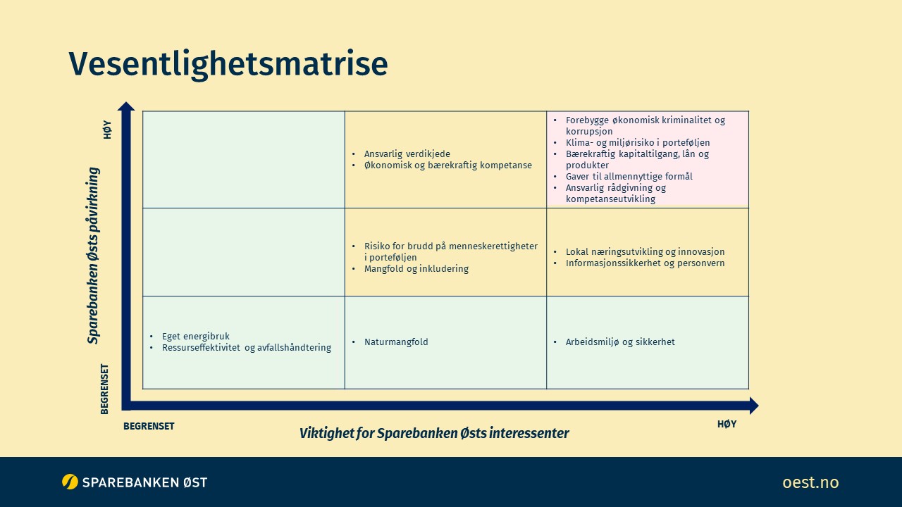 For å kunne prioritere de områdene hvor banken faktisk kan gjøre en forskjell, har Sparebanken Øst gjennomført en vesentlighetsanalyse. En vesentlighetsanalyse er et verktøy for å kartlegge hva som er viktig for en virksomhet og dennes interessenter. Eksempler på interessenter er kunder, leverandører, samarbeidspartnere og samfunnsaktører.