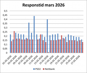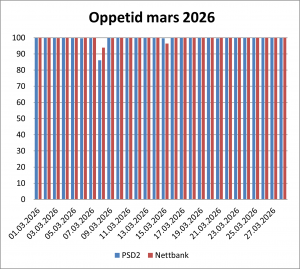 Bankene er pålagt å rapportere oppetid og responstid for våre API-er sammenlignet med oppetid i egne kanaler. Her finner du oppetider og responstider per dag for nettbank og PSD2 API-er.
