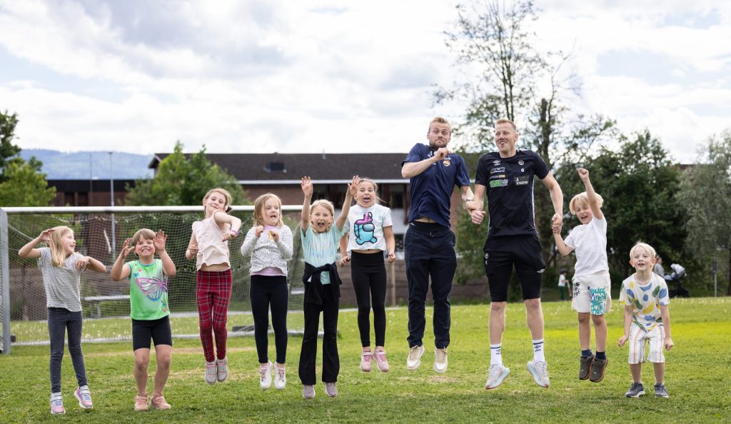 Fotballspillerne er invitert av Sparebanken Øst til Tusenårsstedet ved Krokstad skole rett og slett for å leke. Men ikke uten et visst alvor. De fikk nemlig hard konkurranse fra ti 2-klassinger i kampen om å vinne alt fra «hauk og due», «rødt og grønt lys» og selvsagt ballspill på løkka.