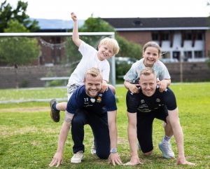 Herman Stengel, fotballspiller i Strømsgodset, og Mjøndalen-spiller, Joackim «Jokke» Olsen Solberg, fikk en leken dag sammen med 2. klassinger fra Krokstad skole. Her ble det gøy både for liten og stor.