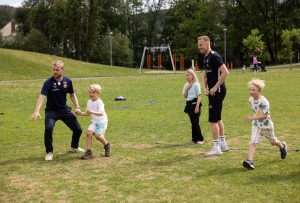 En grønn slette med fotballmål er fylt av trillende latter. To voksne dribler så gresset spruter blant en flokk med ballivrige barn. Her går smilene nesten rundt for alle denne dagen.