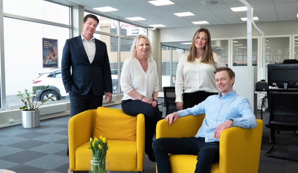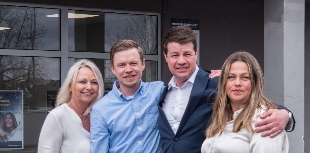 Kjetil Hansen (t.v), avdelingsbanksjef Anette Furunes Green, Anette Wego Karlsen og Even Qvigstad ønsker velkommen til nye lokaler i Slagenveien 16 i Tønsberg. Finansrådgiver Gro Vittring er ikke på bildet, men er også en del av teamet.